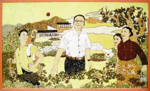 用五谷雜糧作畫,確實(shí)極具創(chuàng)意,但也有很多難點(diǎn)需要克服,比如要防潮防蛀,還要防冷熱變形。因?yàn)橛梦骞入s糧作畫是頭一次,因此廖志春和村民們想了很多辦法:先在板子上打底漆,同時(shí)加上一些防潮物;然后用木工膠將五谷雜糧粘上去,色彩面積小的部位,如皮帶、瓦片等,就得一顆一顆地粘;而像衣服、面部等色彩面積較大的,就需要把谷物灑均勻。