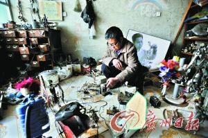 吳玉祿的工場堆滿他苦心搜集來的零件,很多都是從廢品回收站淘來的“寶貝”。