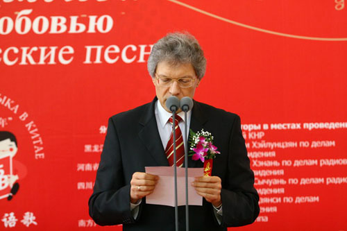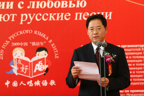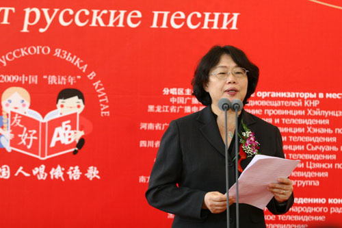 國際在線消息:(記者 衛寧)2009年5月26日,由國家廣播電影電視總局主辦,中國國際廣播電臺、中央人民廣播電臺、北京電視臺聯合承辦的“情動俄羅斯——中國人唱俄語歌大型選拔活動”在北京俄羅斯聯邦駐華使館舉行了盛大的啟動儀式和新聞發布會。教育部副部長郝平、外交部副部長李輝、國家廣電總局副局長田進、中國人民對外友好協會會長陳昊蘇、俄羅斯駐華大使拉佐夫和中國國際廣播電臺臺長王庚年以及活動各大分唱區承辦方代表、中俄兩國媒體記者和俄語界、文藝界代表等150余人共同出席了啟動儀式和新聞發布會。