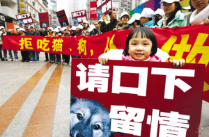 動(dòng)物保護(hù)者高舉拒吃貓狗的條幅。