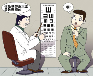 張辰星醫生給李磊做了全面檢查,沒發現眼部有毛病,卻發現小伙子領帶系得很緊。張醫生問他,是否常把領帶系很緊?得到肯定答復后,他又仔細檢查了一遍,得出結論:領帶系太緊,系出近視眼。記者 汪云劍 實習生 舒晴