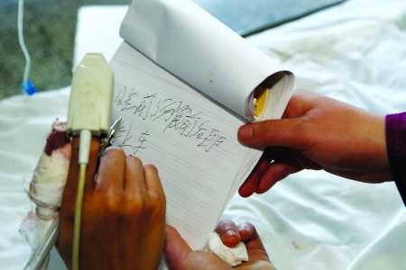 記者看到,25歲的蘇鑫臉色蒼白地躺在病床上,靠呼吸機(jī)呼吸。由于不能說話,蘇鑫只能靠寫字與家人交流。放在病床邊的本子上,歪歪斜斜地記錄著蘇鑫出事的全過程。