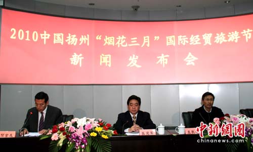 揚州15日舉行新聞發布會宣布,2010中國揚州煙花三月國際經貿旅游節將于本月18日至5月18日在揚州舉行,發布會由揚州市政府秘書長何金發主持。揚州市委常委、宣傳部長袁秋年出席參加,市委常委、常務副市長張愛軍通報了今年“煙花三月”節的有關情況。