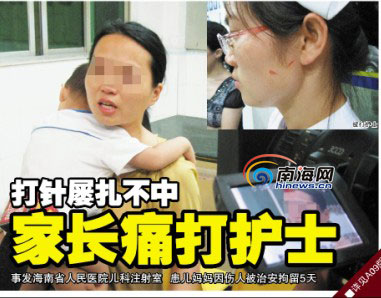 5月19日傍晚,一患兒家長(zhǎng)賈某帶1歲多的兒子到海南省人民醫(yī)院龍華門診兒科輸液室輸液時(shí),因護(hù)士2次扎針未能成功,患兒家長(zhǎng)極為不滿,繼而對(duì)護(hù)士大打出手,造成護(hù)士人中、臉頰等多處受傷。目前,傷人的賈某已被海口濱海派出所治安拘留。