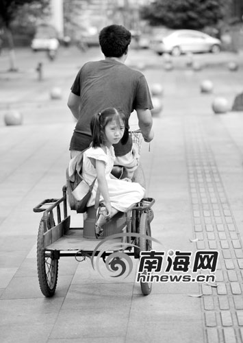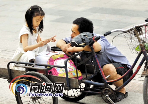 5月24日,南國都市報11版刊登的一張圖片吸引了不少市民的關(guān)注:女孩蹲在破舊的三輪車上,用手指比劃著做算術(shù)。父親蹲在三輪車旁,慈愛地看著女兒。這溫馨的一幕感動了眾多讀者和網(wǎng)友。網(wǎng)友木木留言,“大大的世界也許對這位父親而言有些難以理解,可與生俱來的父愛,讓他知道愛女兒是應(yīng)該的,眼中的溫柔打動著周圍的人。父女之愛,在這一刻悄然傳遞……”這是怎樣的一對父女?25日,記者走進了他們的家。