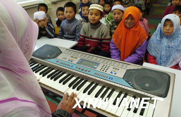 資料圖片:2007年11月19日,穆斯林孤兒院的老師正在給孩子們上音樂(lè)課。寧夏回族自治區(qū)首家穆斯林孤兒院在銀川開(kāi)園。該孤兒院由寧夏穆斯林福利協(xié)會(huì)與科威特亞洲穆斯林委員會(huì)合作修建,建筑面積2100平方米,可容納300名孩子。新華社記者 王鵬 攝