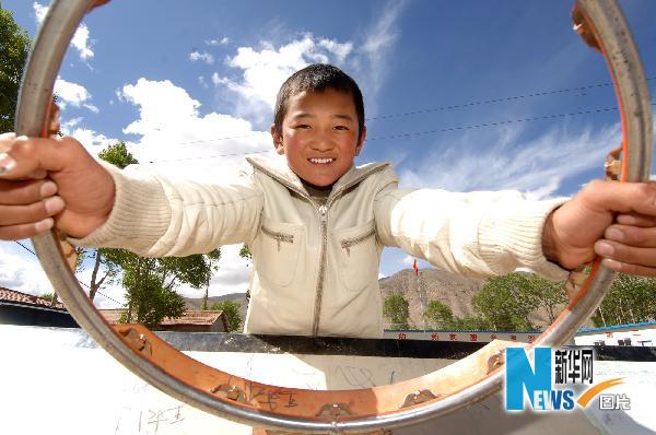 5月29日,玉樹藏族自治州孤兒板房學(xué)校學(xué)生、12歲的格求在學(xué)校操場上玩耍。 新華社記者 張宏祥 攝