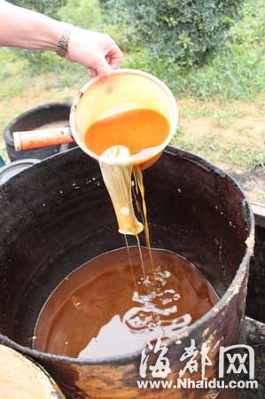 在福清城區、宏路、鏡洋、漁溪、東張等地的小飯館里收集泔水,運到鏡洋鎮東風村東林自然村一個偏僻的果園里加工成地溝油,然后又偷運到當地一些小飯館里。經過簡單加工的地溝油被消費者吃進肚子……本網記者在當地幾位熱心讀者的幫助下,經過數月暗訪,昨日,與鏡洋鎮工商所、鏡洋鎮派出所一起,將這個地溝油地下加工窩點端掉。