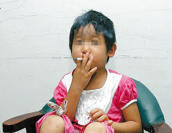 小雅文抽煙的動作利索得令人吃驚,她用右手食指和拇指夾著香煙,悠然自得地點燃,叼在嘴邊,深吸一口,白煙從嘴里和鼻孔慢慢連貫地吐出,中指還不時地彈掉煙灰,抽煙動作儼然是一名老煙民。短短5分鐘,就連續抽了兩根煙。她只是一個不到4歲的女孩,煙齡已經將近一年。