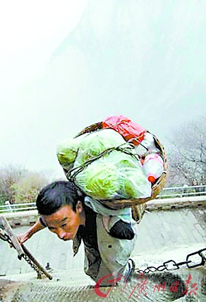 “和泰山挑夫一樣,華山挑夫大多也是扁擔幫,少數(shù)幾個使用背簍的,一看就知是來自四川, 在其他方面,如:一樣的黃膠鞋、一樣摔八瓣的熱汗、一樣風箱般的喘氣、一樣黝黑似鐵的小腿,總之,你眼中的他們大都一樣。我是在千尺幢下初次遇到何天武的,起初沒發(fā)現(xiàn)他與別人的不同,直到需要攀鐵鏈時才發(fā)現(xiàn)他竟然是一位獨臂的殘疾人!千尺幢、百尺峽、老君犁溝、擦耳崖,這些險要的華山路,正常人尚且膽戰(zhàn)心驚小心翼翼,這位獨臂挑夫背著沉重的背簍,是憑著何等的毅力和體能才在這華山安身立命?我放慢腳步,緊隨他的身后,用我的相機拍下他和他的背簍,并觀察他一步一挺,用一只手攀著鐵鏈,艱難地在近乎垂直的峭壁上掙扎!