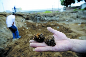 圖為記者在工地現場發現的兩枚鐵疙瘩。晨報記者 郝笑天/攝