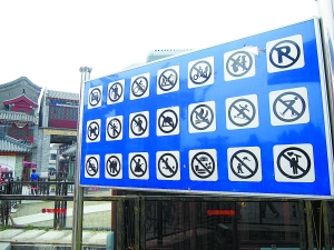 一名新浪網(wǎng)友在自己的博客中以《史上最牛禁令牌》為題記錄下他無(wú)意中在前門步行街發(fā)現(xiàn)的一景。“街頭竟有21道禁令牌,不許玩耍也罷,還不準(zhǔn)吃喝,只剩安分守己、老老實(shí)實(shí)地走路了,真可謂史上最牛!”由于不少標(biāo)識(shí)太過(guò)抽象,網(wǎng)友們紛紛根據(jù)禁令牌“看圖說(shuō)話”,答案是五花八門。