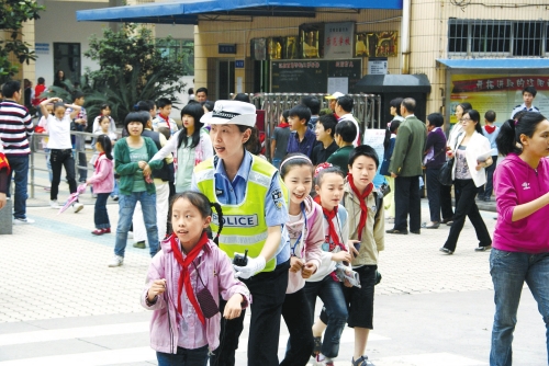 每天上學(xué)和放學(xué)的時(shí)候,瀘州市江陽(yáng)區(qū)西路學(xué)校門前就會(huì)出現(xiàn)一個(gè)女交警,護(hù)送孩子們通過門前的街道。