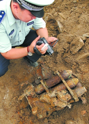 很快,民警在現(xiàn)場拉起警戒線,挖出來的大鐵箱子銹跡斑斑,里面裝有6枚炮彈。隨后,專業(yè)人員對挖掘出來的炮彈和手雷進行了排險操作。當天,工人們又在現(xiàn)場挖出了二三十個手雷。據(jù)了解,這些爆炸物品均屬解放前遺留。