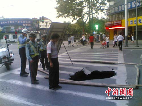 16日下午6時40分許,位于南京長樂路與箍桶巷的交界處的地面突然塌陷,露出直徑兩米、深三米的大坑。事發地點位于主干道,“居中”于斑馬線上,此處人車流十分密集。現場的輔警、交警急忙找來長竹竿圍擋,防止人車二次陷落。