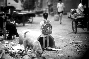 昨日,一名小女孩背著書包站在唐家嶺的大街上。該村拆遷,幾所學校也在拆遷范圍內。本報記者 楊杰 攝
