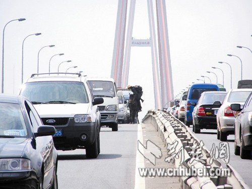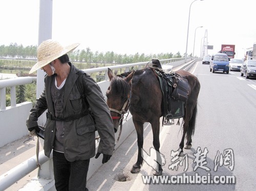 頭頂草帽、肩挎背包,一身厚厚的休閑服,跨下威武的棗紅馬。昨日下午,武漢三環(huán)線長江三橋橋面出現(xiàn)的這名騎士令過往車輛驚愕讓路,交警緊急趕到極力勸阻后將游俠護(hù)送離開城市快速路面。