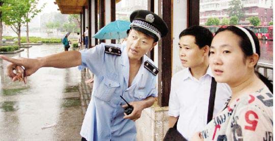 臨近中午,唐輝急忙除下小丑服,迅速趕往武昌火車站。下午3點,大雨傾盆而下。唐輝在涼亭下認真地注視著轄區內的一舉一動。路人前來問路時,他便不厭其煩地介紹。“不客氣,您慢走”,溫和的語氣讓人感到溫暖。