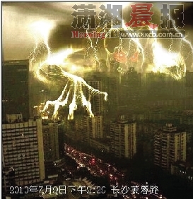 昨日下午2時,一陣電閃雷鳴后,長沙的天空頓時暗了下來,傾盆大雨持續了一個多小時。隨后一張帶有“2010年7月9日下午2:40長沙芙蓉路”字樣的圖片在貼吧里和各個QQ聊天群瘋狂轉載。