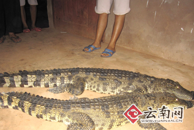 兩條分別重達(dá)60公斤左右的大鱷魚(yú),趴在昆曼大通道勐臘段小磨公路的隧道里被發(fā)現(xiàn)后,兩村民竟然當(dāng)做“蛤蚧”撿回了家中。幸好,兩位村民迅速反應(yīng)過(guò)來(lái)。隨后,森林公安民警及時(shí)趕到,這個(gè)“玩笑”才沒(méi)有開(kāi)大。