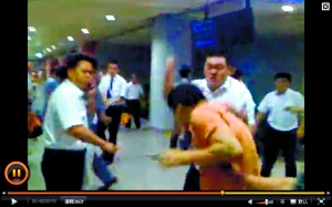 混亂中,數(shù)名東航工作人員追打一名提包的穿著黑衣旅客,一直追打至候機廳另一側,有人衣服破損脫落。
