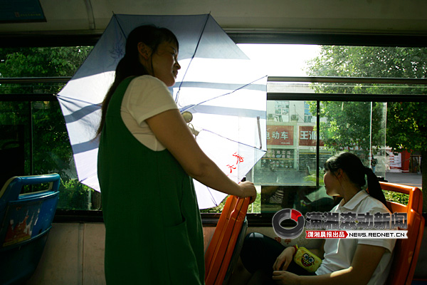 2公交車上,市民撐傘阻擋強烈的太陽。 圖/瀟湘晨報滾動新聞記者 華劍