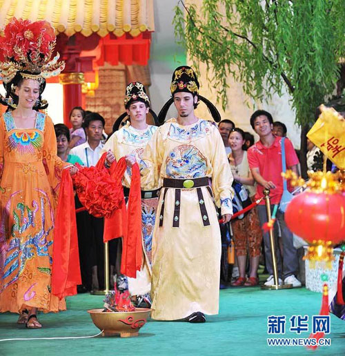 8月14日,在上海世博會陜西館,幾名外國游客在體驗“大唐婚典”。當(dāng)日,上海世博會陜西館為迎接我國傳統(tǒng)節(jié)日“七夕節(jié)”而舉辦的“華清池中華情人節(jié)系列活動”開幕。兩對外國游客現(xiàn)場體驗了“大唐婚典”,感受中國情人節(jié)的浪漫。新華社記者 丁海濤 攝