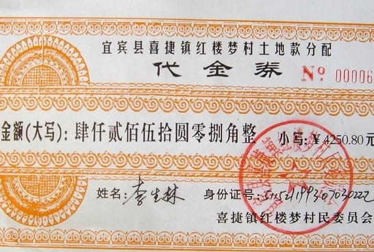 四川宜賓喜捷鎮(zhèn)紅樓夢村的村民近日向中國之聲反映,當(dāng)?shù)卮逦瘯讯嗄陙硗锨忿r(nóng)民的400萬元土地款印成了精美的代金券,替代人民幣發(fā)給了農(nóng)民。這些代金券可以在本村內(nèi)轉(zhuǎn)讓、贈予,還可以繼承。但如果想換成真錢卻要等到60多歲。記者調(diào)查發(fā)現(xiàn),400萬代金券的背后,還隱藏著更大的玄機(jī)。