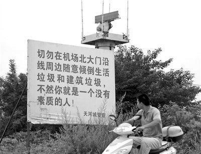 黃陂天河鎮(zhèn)的城管部門(mén),天河機(jī)場(chǎng)北大門(mén)路旁豎起一面標(biāo)語(yǔ):“切勿在機(jī)場(chǎng)北大門(mén)沿線周邊隨意傾倒生活垃圾和建筑垃圾,不然你就是一個(gè)沒(méi)有素質(zhì)的人”,讓不少過(guò)往旅客大跌眼鏡。作為警示標(biāo)語(yǔ),這樣的遣詞造句確實(shí)值得商榷。(高星)