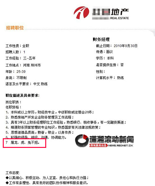 招聘單位為河南一家房地產公司,招聘職位為財務經理,招聘截止日期為2010年9月30日。招聘廣告在“職位描述及具體要求”一項中列出七條要求,除了相關學歷、經驗和個人素質要求外,第七條就是被網友認為“很搞笑”的一項:“屬龍、虎、兔不招。”