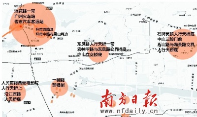 南方日報記者連續(xù)3個月走訪,繪出廣州中心城區(qū)“乞討地圖”,圖中橘黃色為乞丐集中區(qū)。