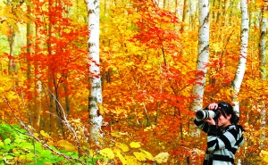 10月7日,游客正在京郊懷柔區喇叭溝門滿族鄉原始森林公園白樺林中觀賞秋色。卜向東攝