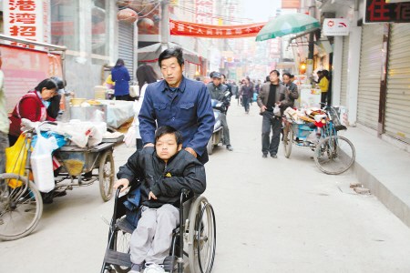 伴著冬日的晨曦,一位中年男子每天早上都推著輪椅從南郊沙井村小巷里走出來,載著他高位截癱的兒子到西安文理學院去上學,在這條約500米長的路上,他和輪椅成了孩子的雙腿,相依為命的父子倆就這樣日復一日地走過了3個年頭。