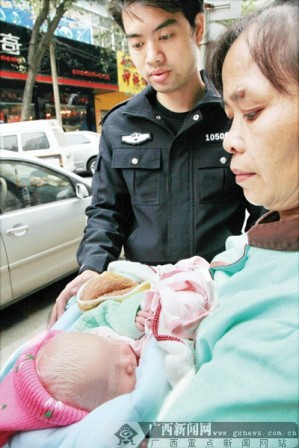 隨后,民警就近進(jìn)行調(diào)查卻沒有任何線索,只好將男嬰帶回派出所。帶回派出所后,一幫“爺們”還真不知道怎么照顧這個(gè)“小家伙”,男嬰在派出所剛睡一會(huì)兒,就發(fā)出了洪亮的哭聲。聽到撿到小孩后,在派出所負(fù)責(zé)衛(wèi)生工作的韋能珍阿姨,也立即趕到值班室里幫助照顧男嬰。聽到小孩開始哭了,大家都認(rèn)為男嬰可能餓了,一名民警立即跑到附近店鋪買來一瓶牛奶,給男嬰喂食起來。男嬰很能吃,大概持續(xù)吃了一兩牛奶后,就開始安心地睡覺了。