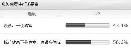 但是,新浪網(wǎng)針對“拆遷暴富”進行的一項網(wǎng)友投票卻顯示,56.6%的人認為“拆遷致富不是真富,有很多隱憂”。