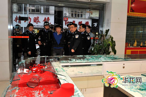 11月24日上午8點45分許,一名手持鋼棒的蒙面歹徒突然闖入剛剛開門準備營業的南川鬧市區“南川金店”,歹徒二話不說,進門后用鋼棒將店內的柜臺砸壞,將柜臺內的黃金首飾裝入口袋后,迅速逃離現場。