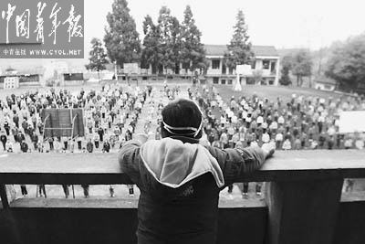 11月19日上午,湖南省張家界市永定區三家館鄉三家館小學一名受傷的學生趴在教學樓上看同學做早操。這棟教學樓是1992年修建的,近20年來少有維修,顯得十分破舊。記者 謝洋攝