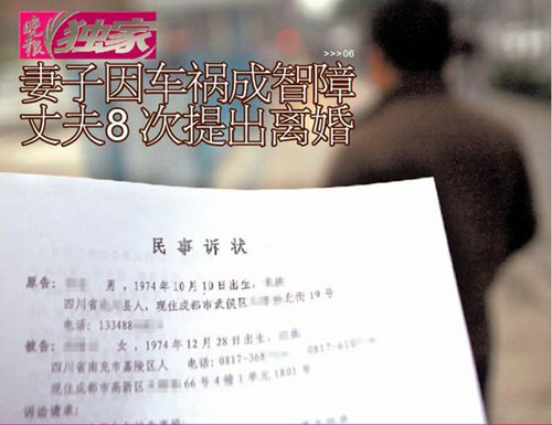 丈夫駕車(chē)出車(chē)禍,同車(chē)的妻子受傷成智障殘疾人,4年時(shí)間里丈夫7次起訴離婚均被駁回。該事件被披露后,有網(wǎng)友戲稱(chēng)丈夫是“離婚哥”。昨日,該事件有了最新進(jìn)展,女方父母稱(chēng),他們發(fā)現(xiàn)女婿與另一名女子又結(jié)婚了,于是向武侯警方報(bào)案,控告女婿涉嫌重婚等罪名。目前,警方已經(jīng)受理了此案。