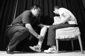 小皮的父親正在給女兒戴假肢。2007年,小皮出車禍飛蘭州治療,遭拒延誤治療右腿截肢。本報資料圖片 浦峰 攝