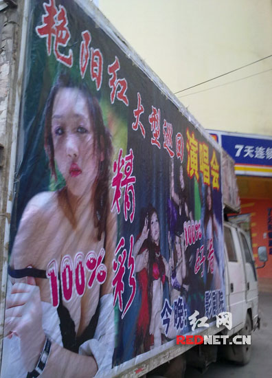 宣傳車就停靠在長沙汽車南站電影院門口附近。宣傳畫面變化了,變成幾個年輕女子袒胸露乳“色誘”乘客。表演節(jié)目名稱變成了“艷陽紅大型巡回演唱會”。