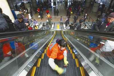1月19日上午,記者在北京西客站看到,車站旅客較前幾日明顯增多,但秩序井然。車站工作人員隨時(shí)待命。圖為一位清潔工正在擦洗電梯,她說(shuō)今年要加班回不了老家。記者 楊登峰 攝