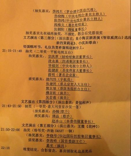 有媒體拍攝了晚宴的詳細(xì)節(jié)目流程。從流程來(lái)看,長(zhǎng)達(dá)兩個(gè)多小時(shí)的晚宴共安排了5個(gè)部分的文藝表演,其中袁小海表演了京劇《智取威虎山》的片段、小沈陽(yáng)獻(xiàn)唱了歌曲、姜昆更是現(xiàn)場(chǎng)表演了即將在春晚上演唱的相聲……閻維文、孫曉梅、畢福劍、濮存昕、吳若甫、譚晶、孫楠、趙本山、葛優(yōu)等則分別擔(dān)任了現(xiàn)場(chǎng)各抽獎(jiǎng)環(huán)節(jié)的嘉賓。
