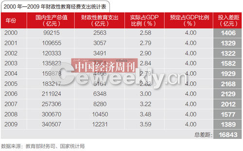 根據教育部財務司、《中國統計年鑒2009》及國家統計局公布的數據計算,從2000年到2009年10年間,以4%的比例為目標,則國家財政性教育經費支出10年累計“欠賬”已達16843億元。2002年到2003年間,經費投入甚至還出現了0.06%的倒退。截至2009年,國家財政性教育支出12231.09億元,占國民生產總值的3.59%。