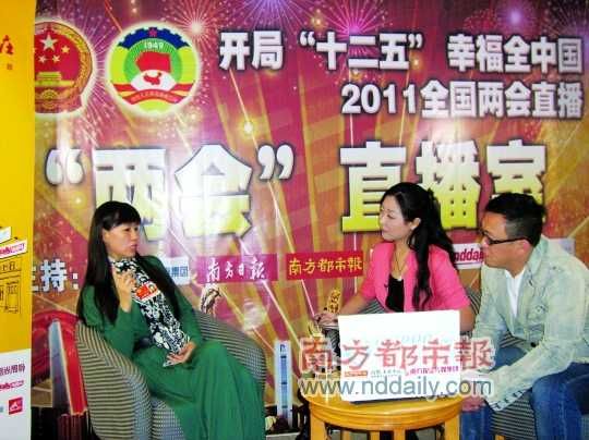 美女委員張曉梅(左)做客南方報業(yè)南都全媒體兩會直播室,暢談“讓女性回家”及“剩女”等熱點話題。中為主持人、南都記者裘萍、右為男嘉賓、南都記者劉可。 鄒高翔 攝