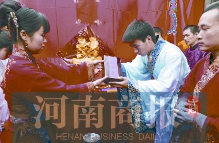 新郎和新娘將割下綁在一起的頭發放在盒子里,交給旁邊的侍從(圖片來源:大河網)