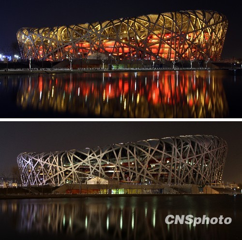 2010年3月27日晚8:30-9:30,“地球一小時”活動期間,國家體育場“鳥巢”關閉景觀照明,號召人們關注氣候變化帶來的挑戰(zhàn)。 中新社發(fā) 余明 攝