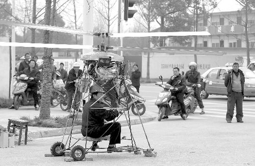 昨日,又一架手工打造的“土飛機”出現在雙橋子一座工地上。它的頂部是雙層反向螺旋槳,槳柱下面,有兩臺摩托車的發動機。下方則是用拇指粗的鋼管焊接起來的“機艙”,形似鳥籠。一只摩托車的把手垂在“機艙”里,據說是用來啟動發動機并控制螺旋槳方向的。