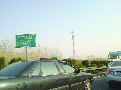 免費(fèi)標(biāo)識(shí)牌不知被誰(shuí)抹掉了“200米”“免費(fèi)放行”的字樣。記者昨日下午攝于潤(rùn)揚(yáng)大橋收費(fèi)站前 資料圖片