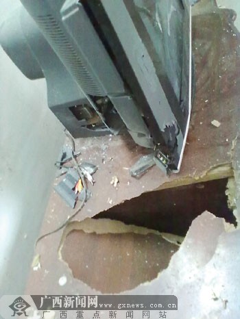 爆炸發生后,電視機和電視機柜都出現了大洞。