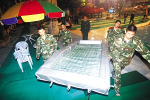 它的體重只有30公斤,長僅3.6米、寬1.6米、高0.2米。它就是“新型便攜式冰上(水面、沼澤)救援平臺”。在歷時三年和200余次的試驗后,昨天終于在世人面前亮相了。昨天晚上7時50分,石家莊市公安消防支隊第十中隊的官兵們應記者邀請,在天山海世界對它進行了一番試驗。